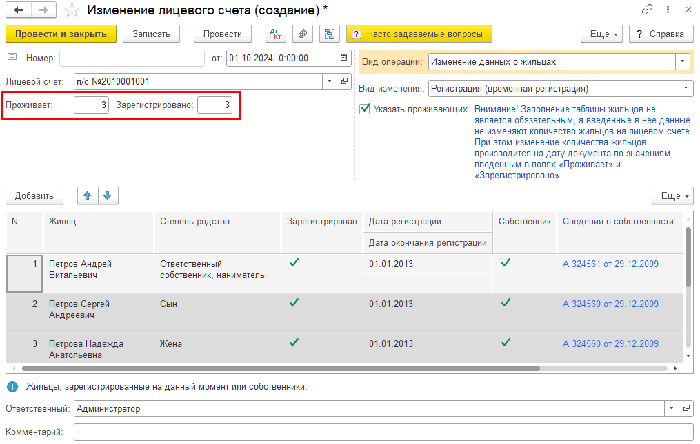 Пример. Необходимо бессрочно зарегистрировать сына ответственного владельца по лицевому счету с 01.04.2019. Сын является собственником с долей 1/2. Для отражения регистрации выполним следующие действия: