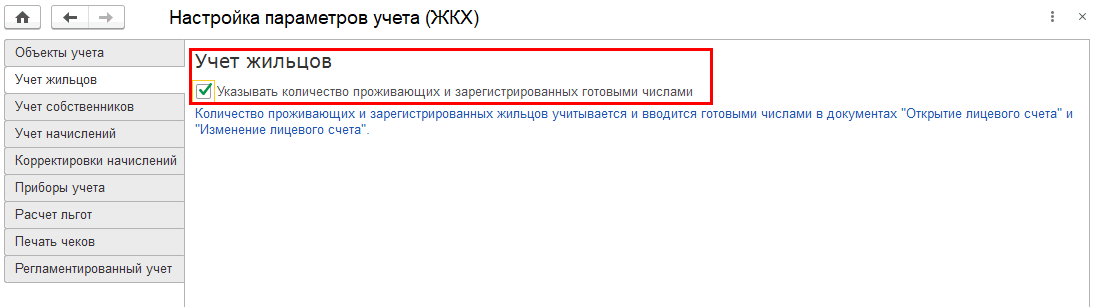 Если в программе учет жильцов ведется готовыми числами (в настройках параметров учета ЖКХ на закладке «Учет жильцов» установлен флаг «Указывать количество зарегистрированных и проживающих готовыми числами»), то в документе «Изменение лицевого счета» количество зарегистрированных и проживающих вводится цифрами в соответствующие поля. При этом табличную часть с жильцами заполнять необязательно:
