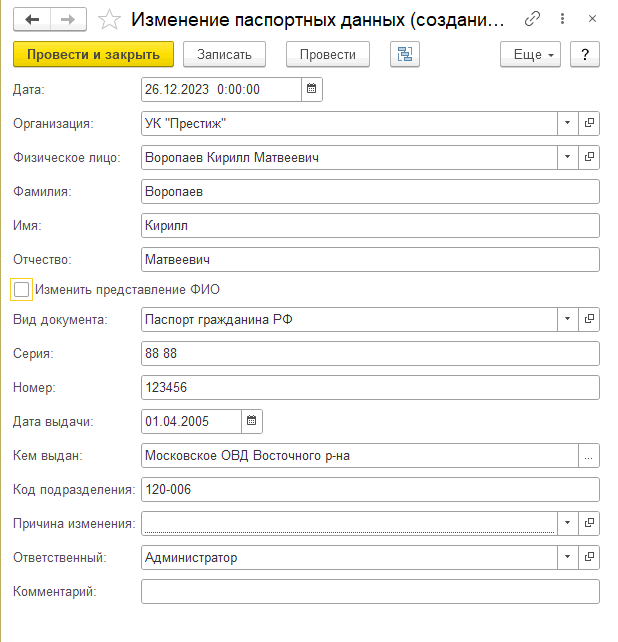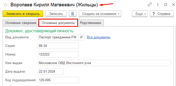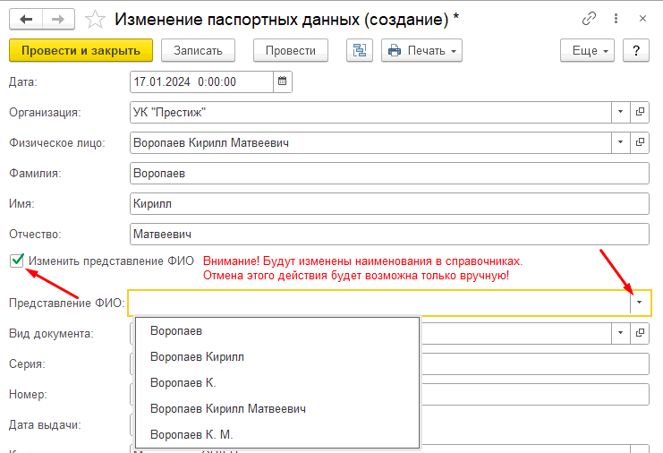 Присваиваем новые значения реквизитам паспорта. При необходимости можем изменить представление ФИО жильца доступным значением из списка или внести запись вручную: