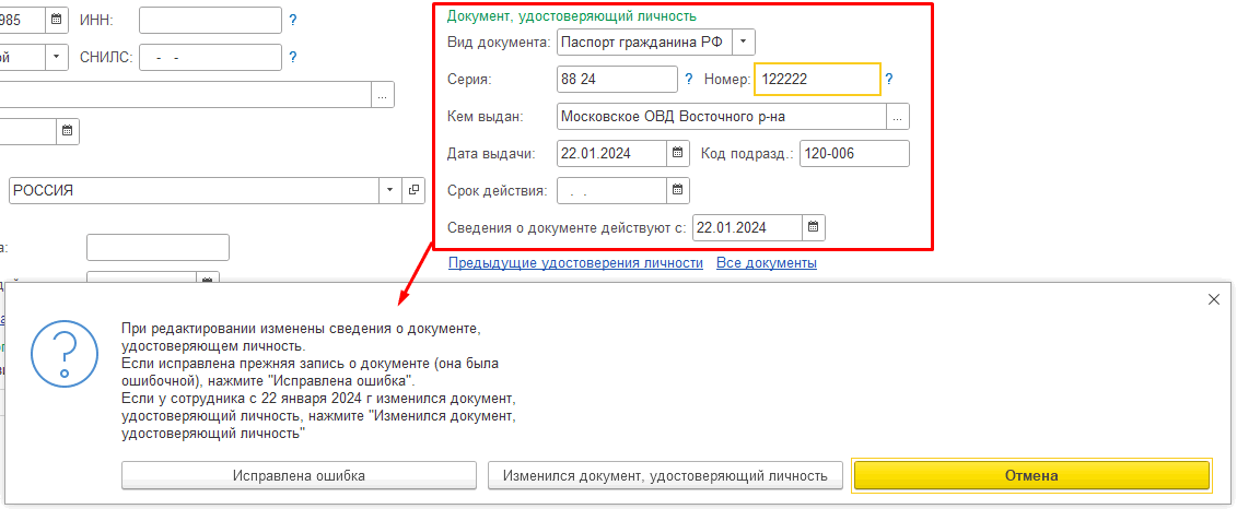 Запишем изменения, после этого можем вывести на печатную форму новые сведения о документе, удостоверяющем личность: