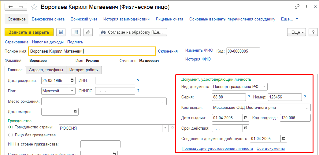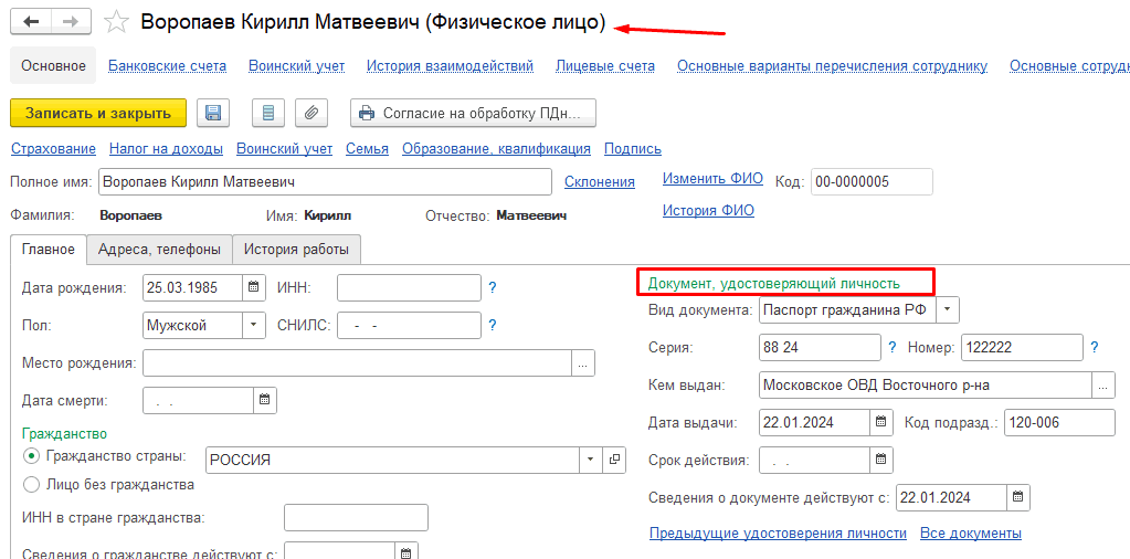 В правой части вкладки «Главное» представлены данные по документу, удостоверяющему личность: