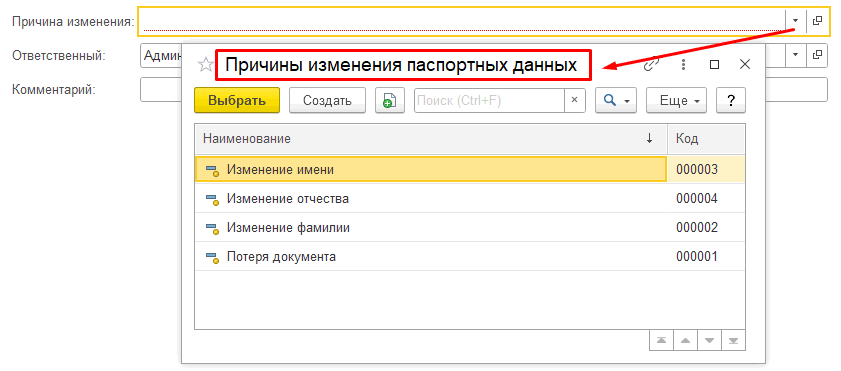 Выбираем причину изменения, выбрав значение либо из справочника предопределенных элементов, либо создав новый элемент в списке: