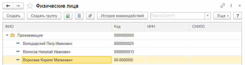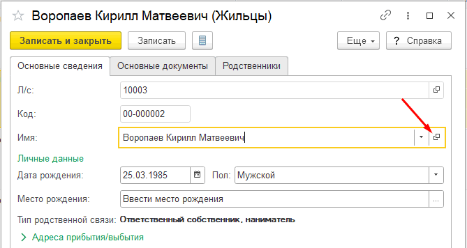 Перейдем в карточку нужного жильца, и, нажав на два квадратика, откроем карточку физического лица: