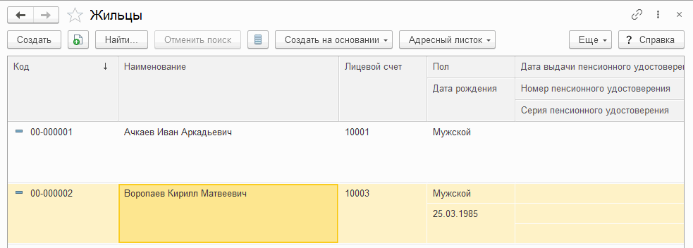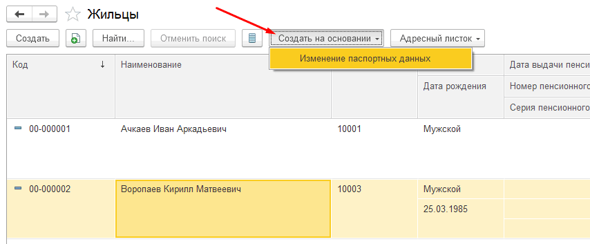 Через общий список в справочнике «Жильцы», нажав по кнопке «Создать на основании» в верхней части программы: