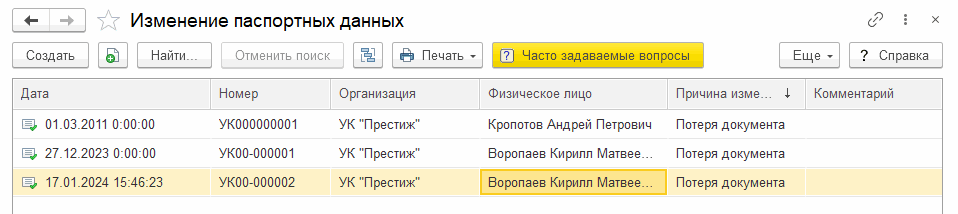 Документ «Изменение паспортных данных» заполняется имеющимися паспортными данными в базе: