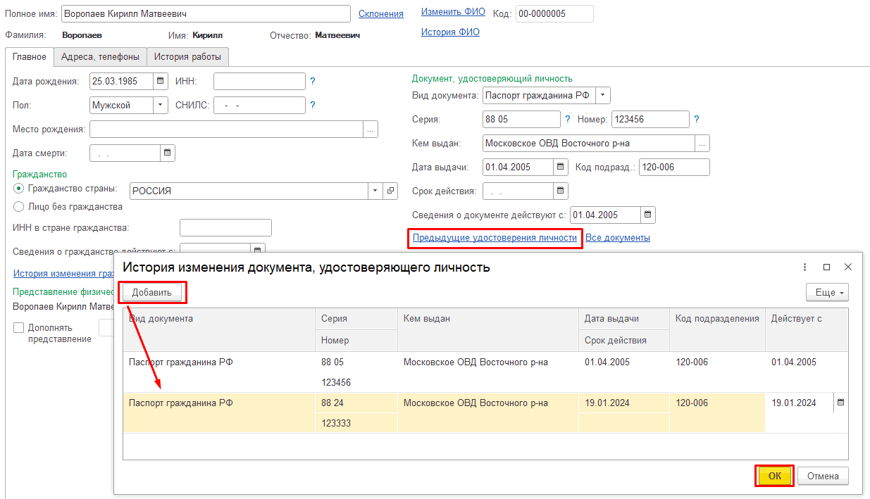Для изменения паспортных данных из карточки физического лица можем открыть историю изменения документа, удостоверяющего личность, и нажав кнопку «Добавить», ввести новую информацию: