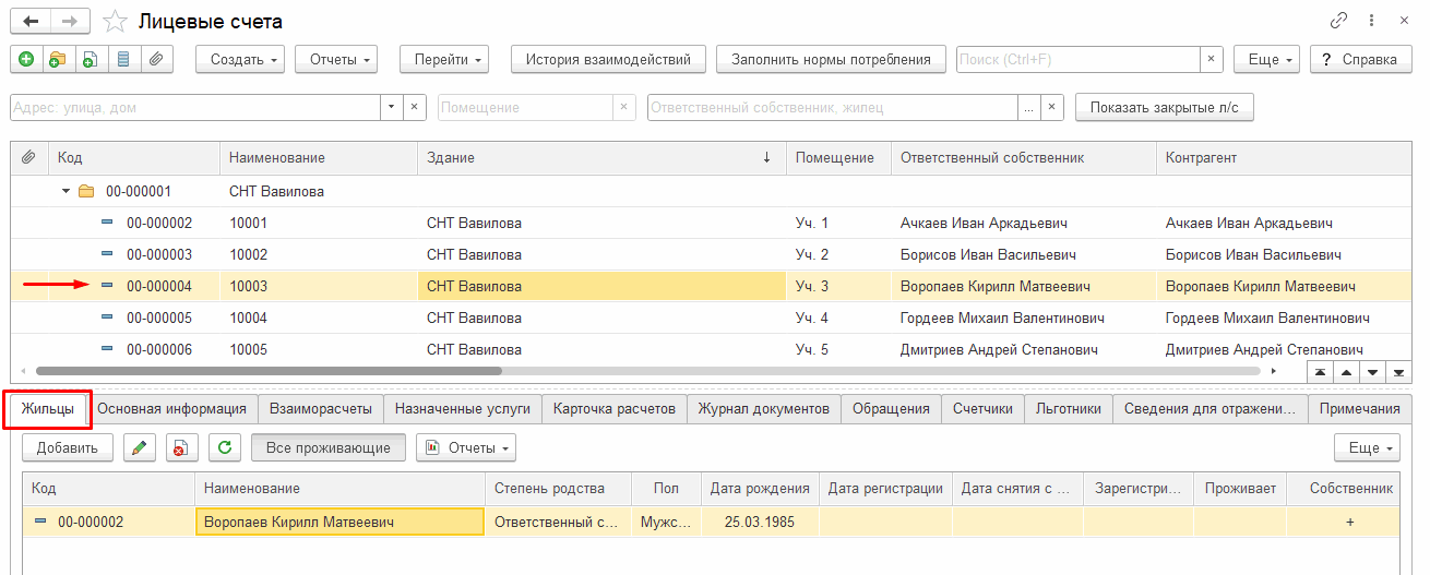 Через справочник «Жильцы» раздела «Управление лицевыми счетами»:
