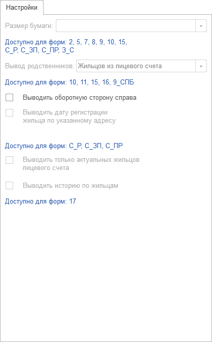Кроме этого доступны различные настройки печати в зависимости от выбранной формы: