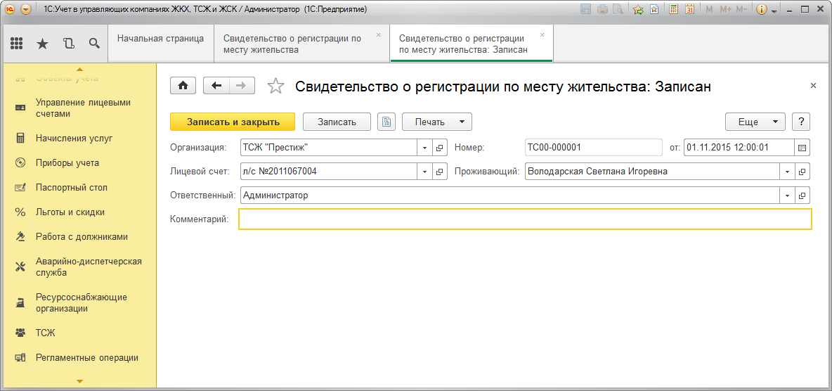 В документе указывается лицевой счет и жилец, которого необходимо зарегистрировать по месту пребывания. На каждого регистрируемого необходимо создавать отдельный документ. Если жильца нет в справочнике «Жильцы», нужно предварительно создать его.