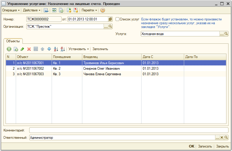 Все начисления обязательно должны быть назначены документом «Назначение услуг». Если указанный документ не введен, лицевой счет не попадет в табличную часть документа «Начисление по показаниям приборов учета»