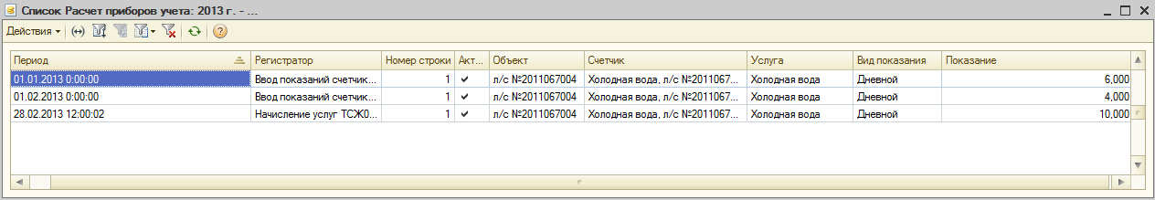 Пример: показания введены датой 31.01.2013, а начисления 30.01.2013.