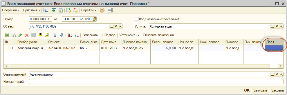 4. В документе «Ввод показаний счетчика» не указаны доли.