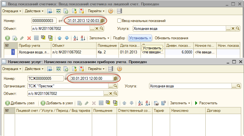 Важно понимать, что в первую очередь вводятся показания счетчика, а уже затем производится расчет начислений. Необходимо обращать внимание не только на дату документов, но и на время.