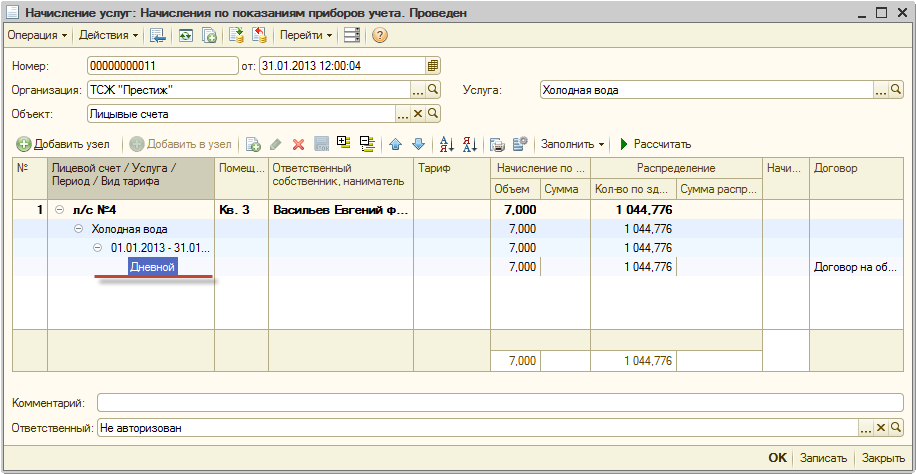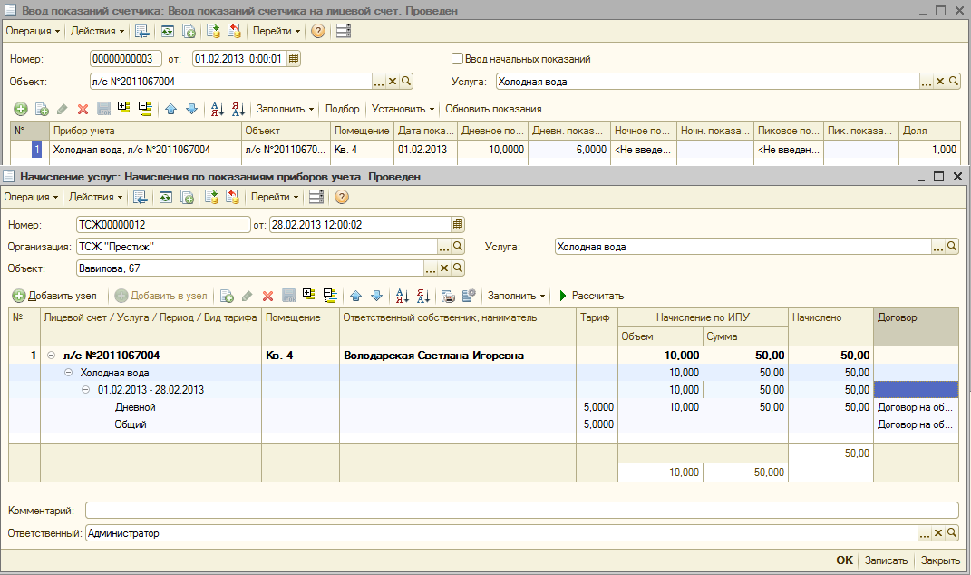 Расход прибора учета при начислениях определяется согласно указанной доле из документа «Ввод показаний счетчика». Если доля не указана, введенные показания не будут учтены.
