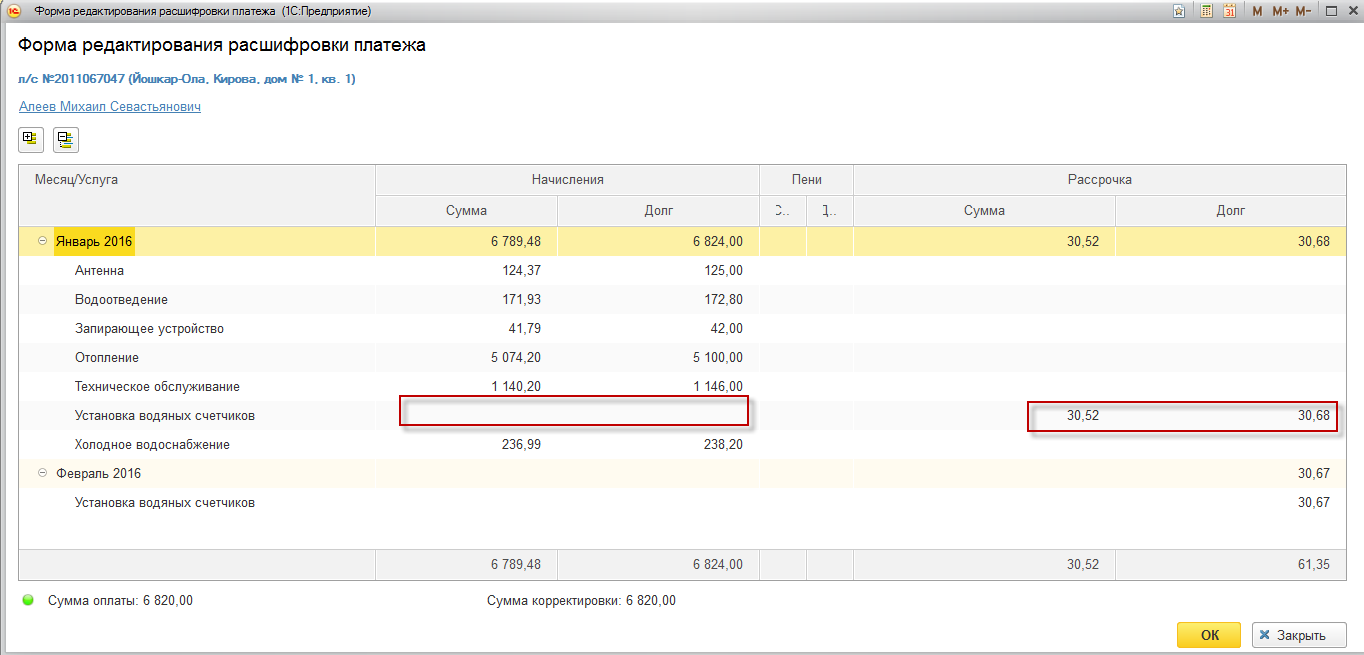 При формировании оплаты (меню «Начисления услуг – Оплата – Регистрация оплаты») отражается задолженность отдельно по начислениям и отдельно по рассрочке: