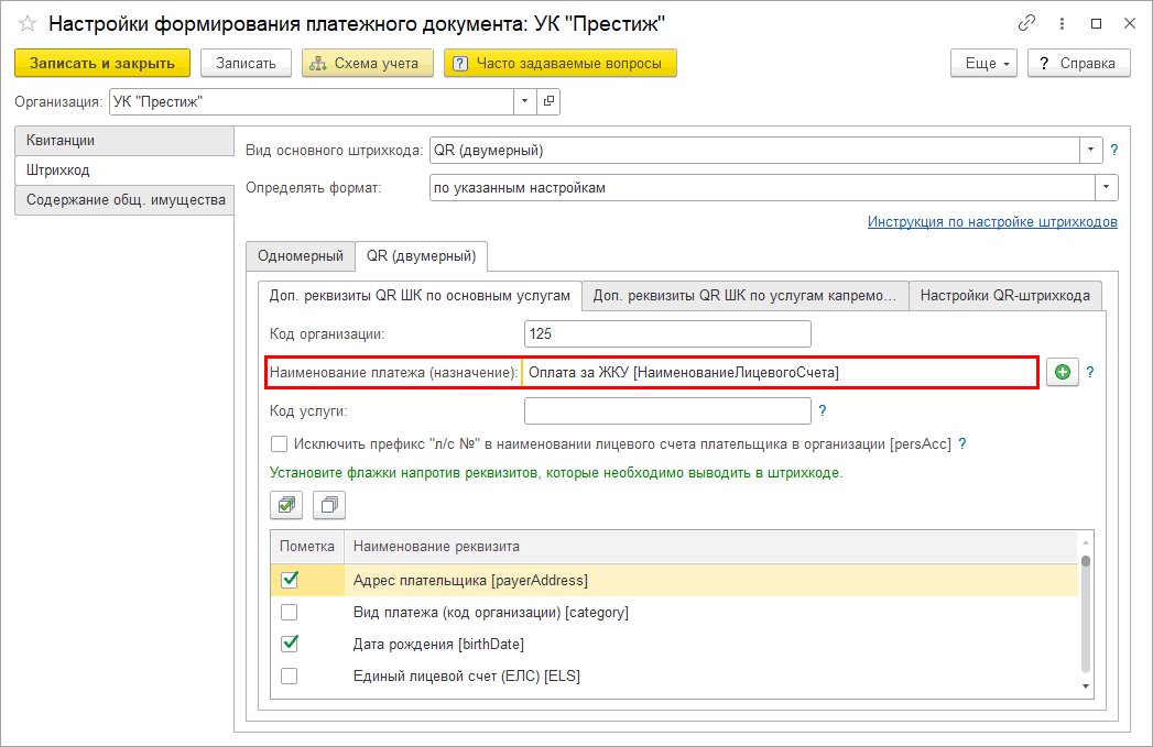 Зайдем в меню «Главное – Настройки ЖКХ – Настройки формирования ПД» и перейдем на закладку «Штрихкод».