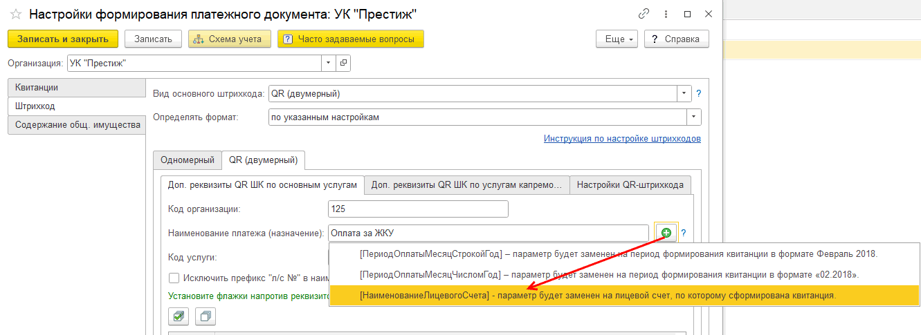 В настройке QR кода в поле «Наименование платежа (назначение)» нажмем на значок «+» и выберем параметр «[НаименованиеЛицевогоСчета]».