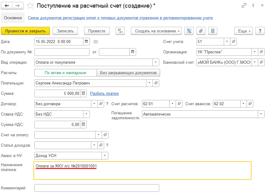 В программе 1С: Учет в управляющих компаниях ЖКХ, ТСЖ и ЖСК ред. 3.0 есть настройка, которая позволяет добавить в назначение платежа лицевой счет. Рассмотрим, как это сделать.