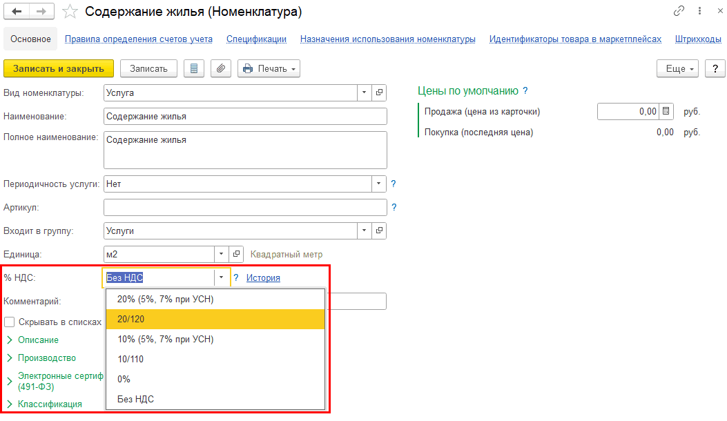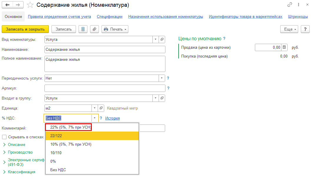 Ставка НДС выбирается в справочнике «Номенклатура». Но ставки 22% в списке нет: