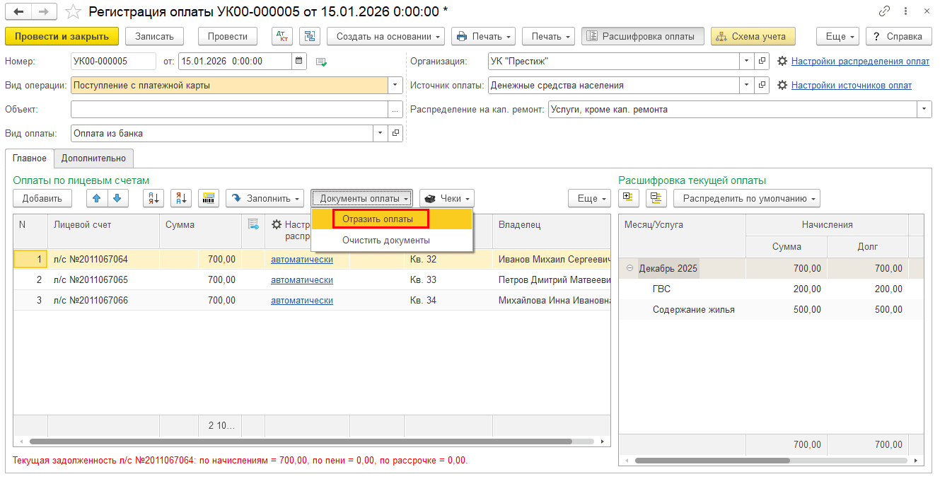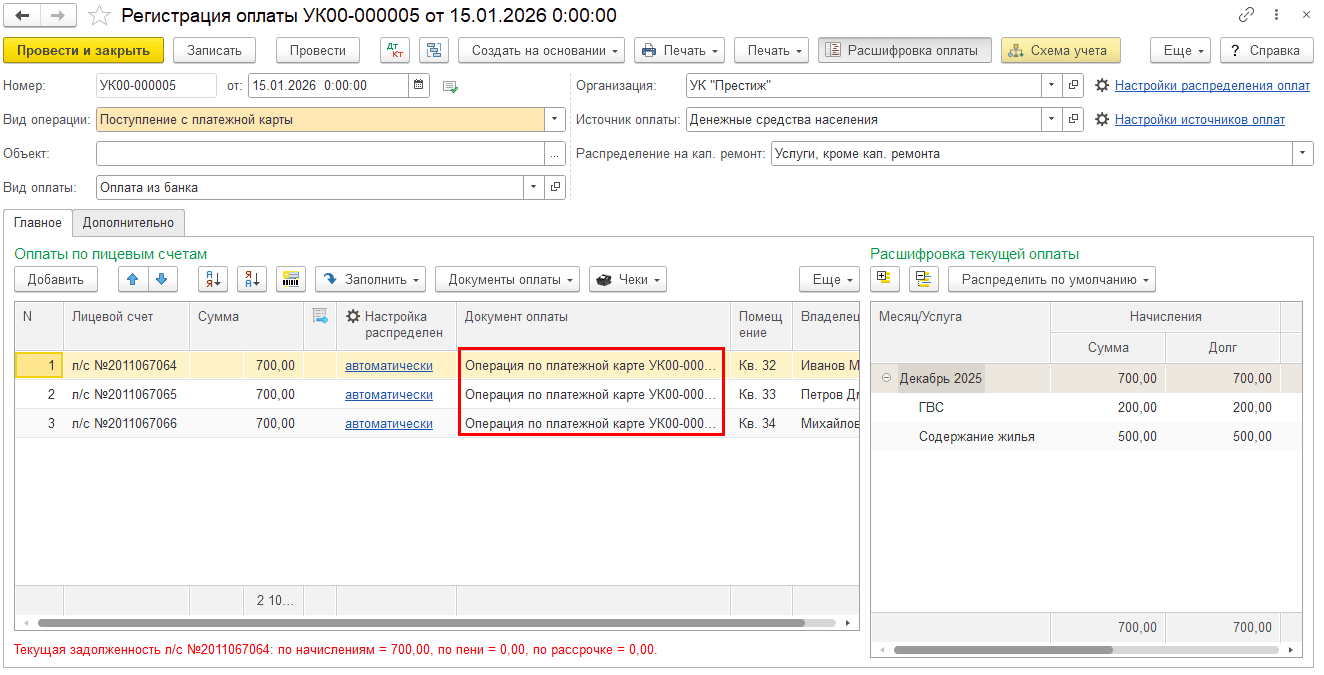Шаг 3. Создайте документы «Поступление с платежной карты» по лицевым счетам.