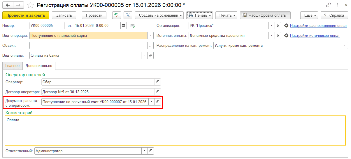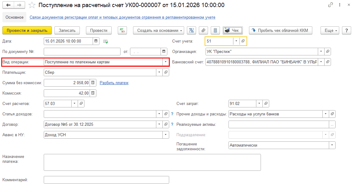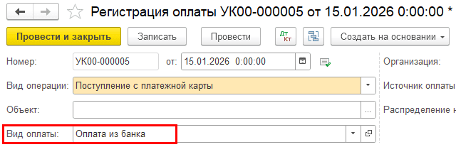 Откройте созданный документ «Регистрация оплаты» и поменяйте вид операции на «Поступление с платежной карты»: