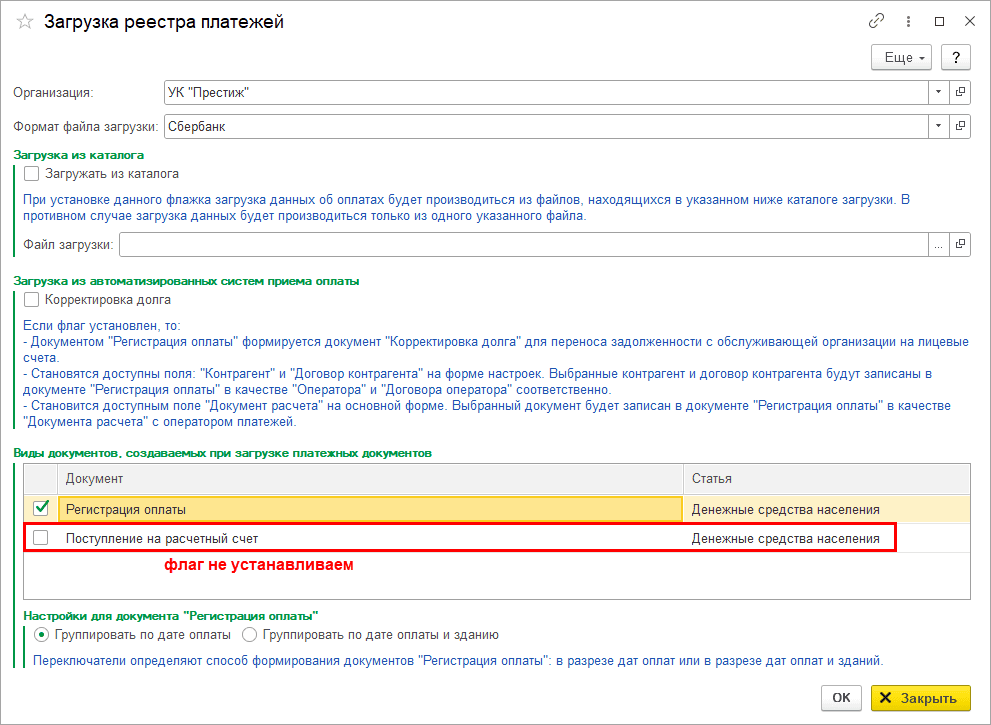 документы «Поступление на расчетный счет» создавать не нужно, т.к. поступление денег на расчетный счет уже отражено ранее общей суммой по банку. Чтобы документ не создавался, в настройках обработок снимите флаг «Поступление на расчетный счет»: