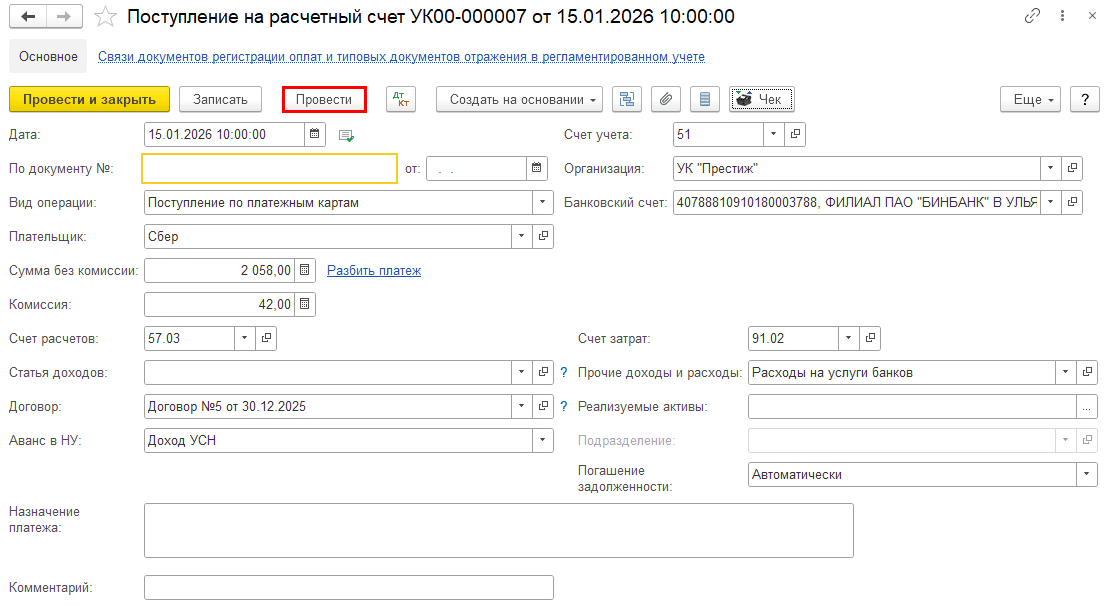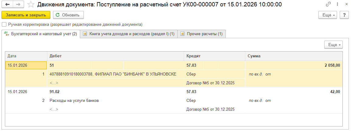Шаг 4. Перепроведите документ «Поступление на расчетный счет» по банку.