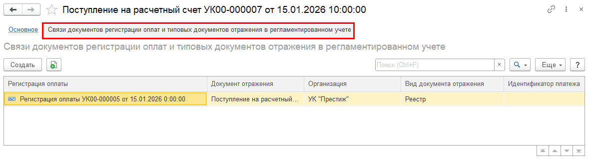 В разделе «Связи документов регистрации оплаты и типовых документов отражения в регламентированном учете» есть запись: