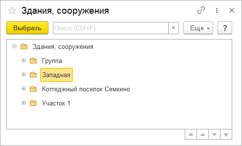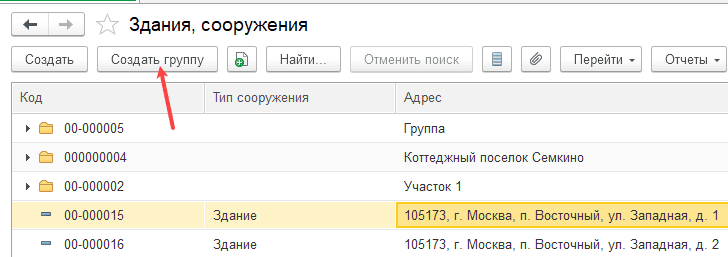 В справочнике «Здания, сооружения» проверьте наличие папки, при необходимости создайте ее по кнопке «Создать группу»: