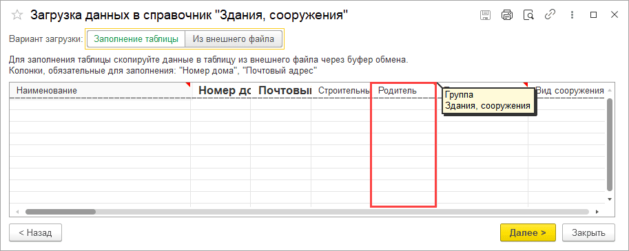 Чаще всего загрузка зданий используется при переходе с других программ. В этом случае данные можно выгрузить из старой системы (если поддерживается формат Excel) или подготовить Excel-файл на основе отчетов. После загрузки в 1С здания создаются автоматически и становятся доступны для дальнейшей работы.