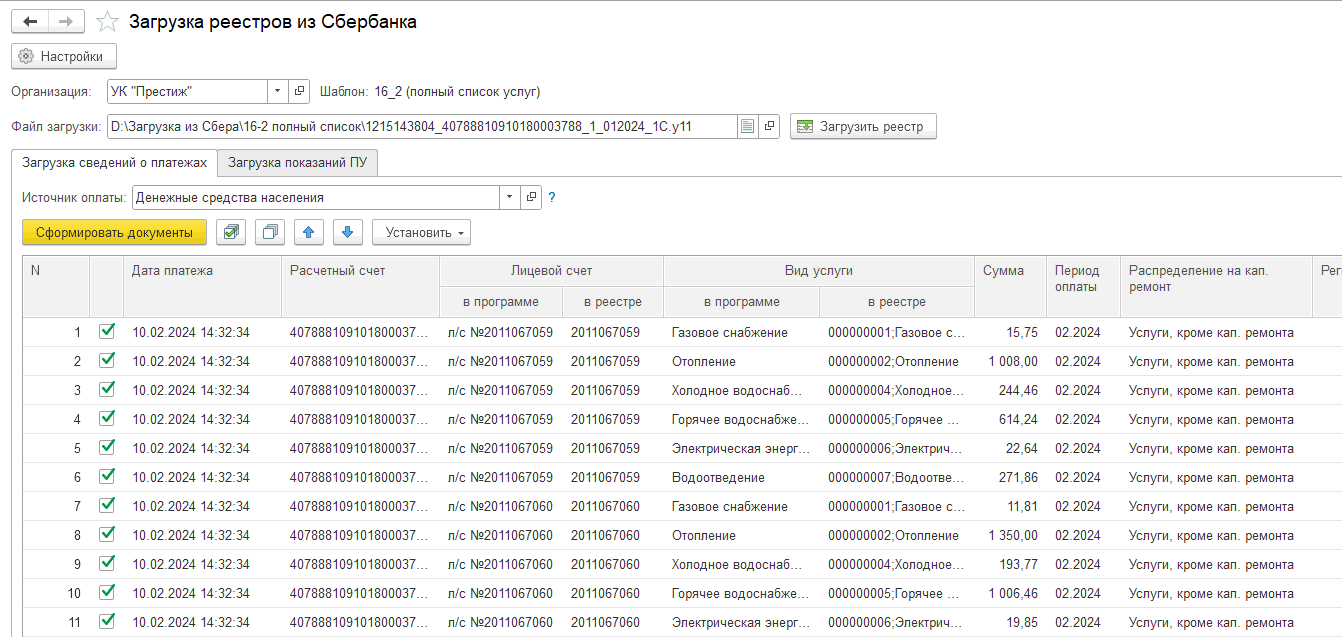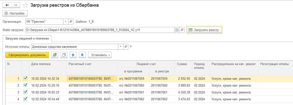 При загрузке реестров можно создать документы «Регистрация оплаты», «Ввод показаний счетчиков» (для шаблонов, поддерживающих передачу показаний) и «Поступление на расчетный счет» (если установлена соответствующая настройка) по кнопке «Сформировать документы».