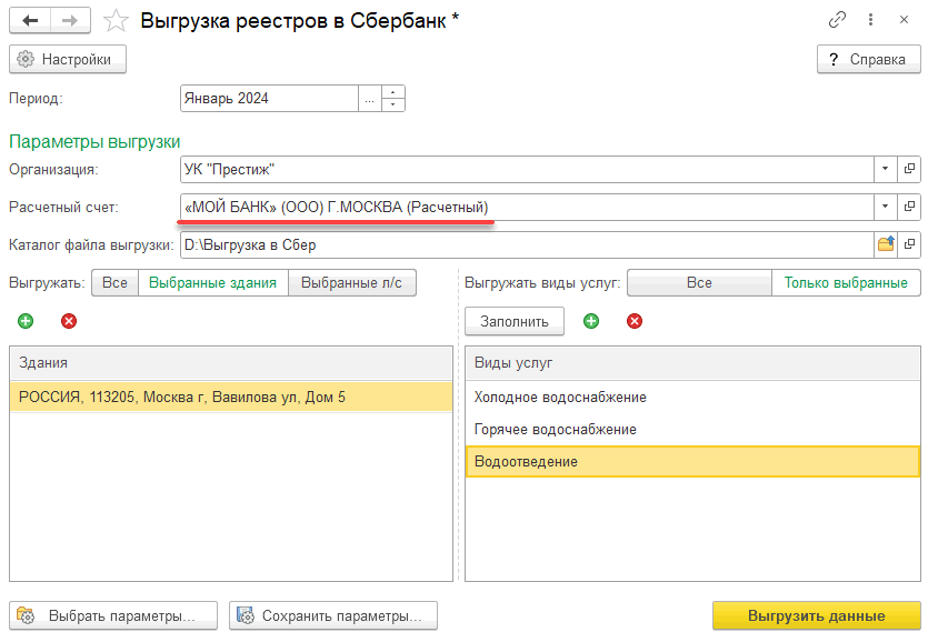 Для выгрузки данных необходимо открыть обработку «Выгрузка реестров начислений в Сбербанк» и указать период выгружаемых данных, а также расчетный счет, который будет использован для формирования имени файла выгрузки. При необходимости можно выбрать здания, лицевые счета и услуги, по которым будут выгружены данные: