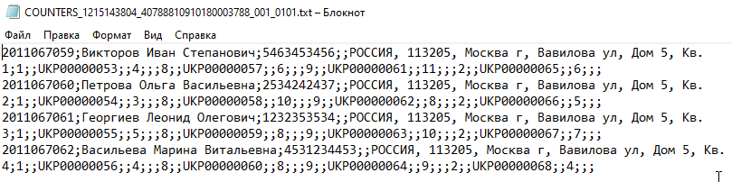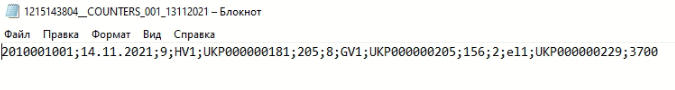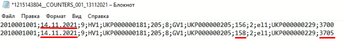 Если в одном реестре содержатся показания по одному и тому же счетчику за несколько дней, то при загрузке учитываются показания за самую позднюю дату, например: