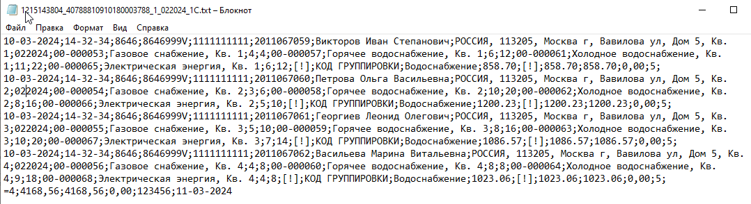 При использовании данного шаблона по каждому лицевому счету все суммы и подуслуги по каждому получателю группируются (собираются) в одной строке и обозначаются наименованием группы (например, «Горячее водоснабжение (2 компонента)» как в примере на картинке).