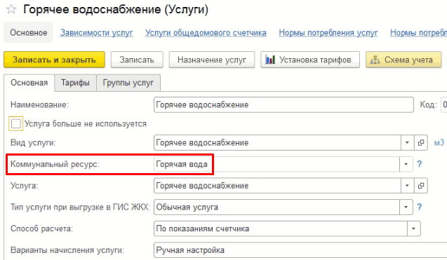 Для шаблона необходимо настроить соответствие услуг в базе 1С типам приборов учета. При этом услуги заполняются автоматически, если у них указаны соответствующие значения в поле «Коммунальный ресурс»: