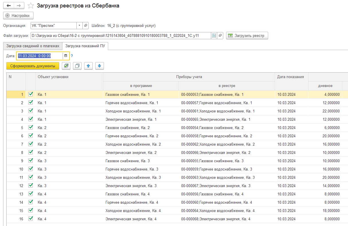 А на закладке «Загрузка показаний ПУ» будут загружены показания по каждому из приборов учета, имеющихся в реестре: