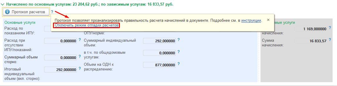 Для отключения режима отладки расчетов необходимо открыть подсказку (значок «?») рядом с кнопкой «Протокол расчетов» и нажать на ссылку «Отключить режим отладки расчетов»: