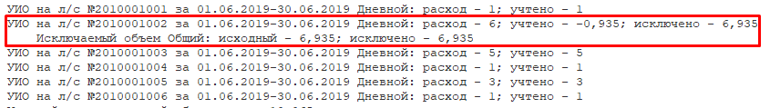 Расшифровка расчета учетного индивидуального объема. При этом отображается время начала и окончания расчета, настройки, по которым был произведен расчет, и расшифровка расчета по каждому лицевому счету отдельно: