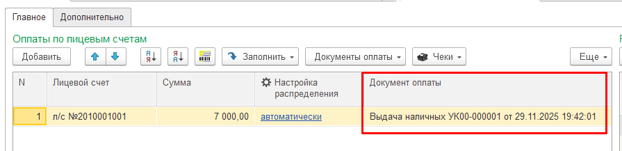 Чтобы перенести оплату с л/с №2010001001 на л/с №2010001002 без изменения самого документа выполним действия: