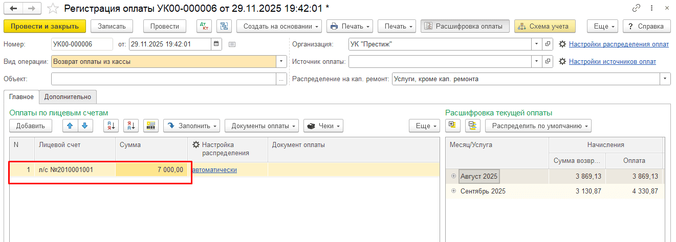 Чтобы отразить возврат оплаты в блоке ЖКХ выполните действия: