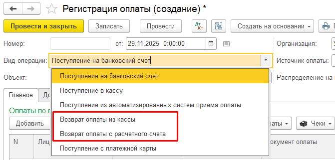 Шаг 2. Выберите один из видов операции «Возврат оплаты из кассы» или «Возврат оплаты с расчетного счета» в зависимости от того, куда поступала некорректная оплата и куда сумму необходимо вернуть: