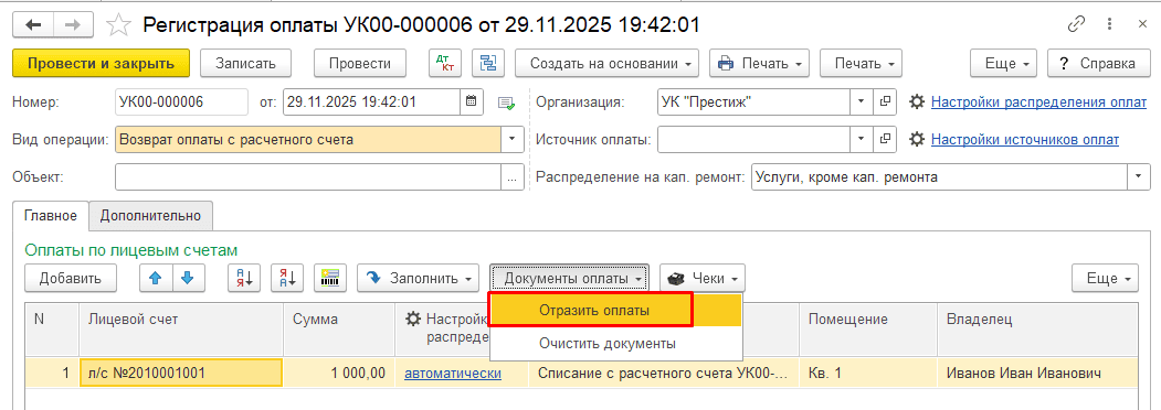 Шаг 6. Нажмите кнопку «Документы оплаты → Отразить оплаты», чтобы отразить поступление оплаты на лицевой счет л/с №2010001002 в блоке бухгалтерии: