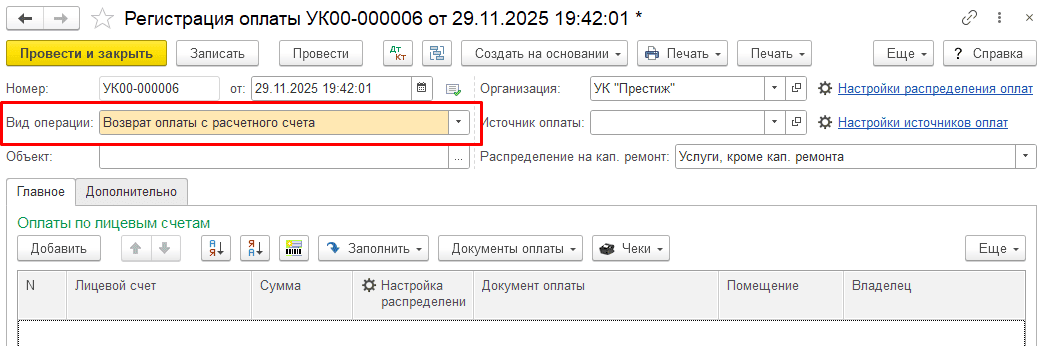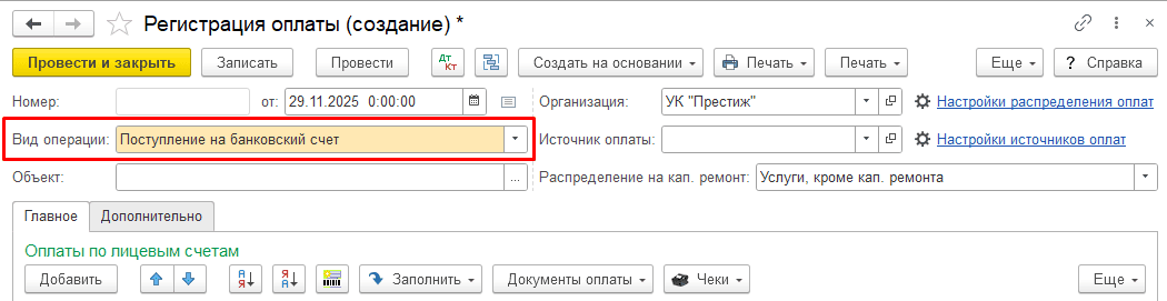 Шаг 1. Создайте документ «Регистрация оплаты» в меню «Начисления услуг → Оплата → Регистрация оплаты».