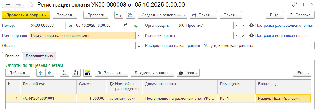 В программе 1С: Учет в управляющих компаниях ЖКХ, ТСЖ и ЖСК оплаты отражаются в блоке ЖКХ документом «Регистрация оплаты». Подробное описание работы документа.