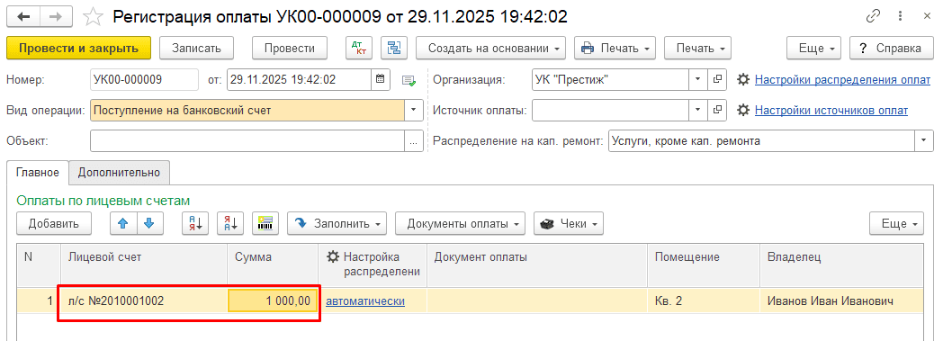 По лицевому счету л/с №2010001001 была отражена оплата в размере 1000 руб.: