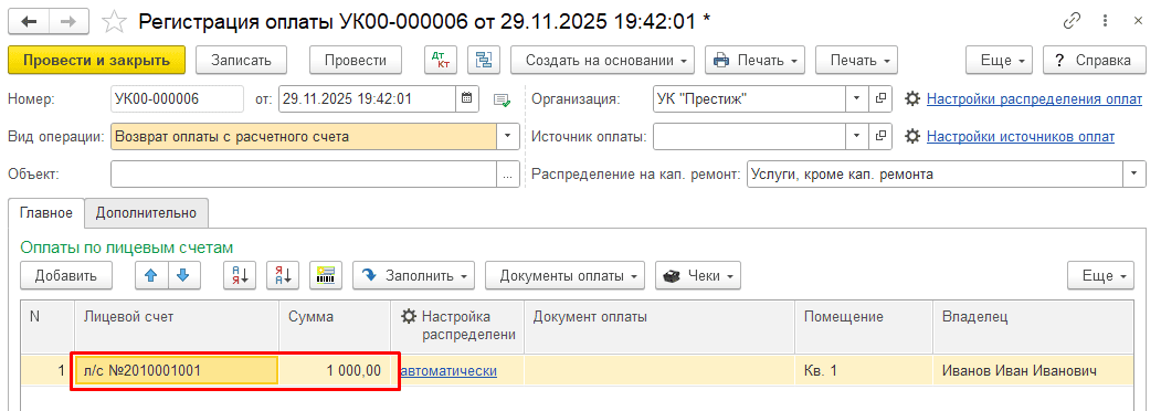 Шаг 2. Укажите лицевой счет л/с №2010001001 и сумму возврата 1000 руб.: