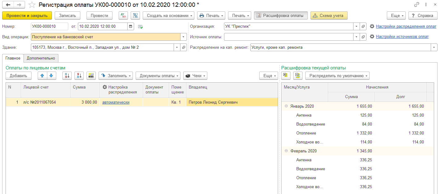 В результате проведения документа производится распределение переплат на долг по услуге «Отопление»: