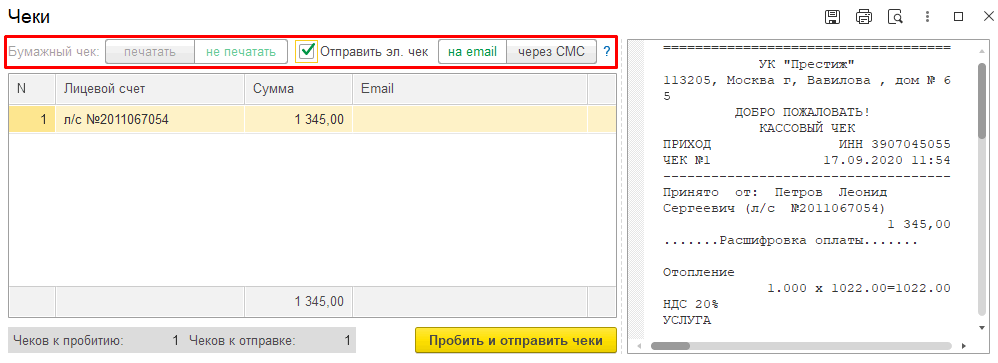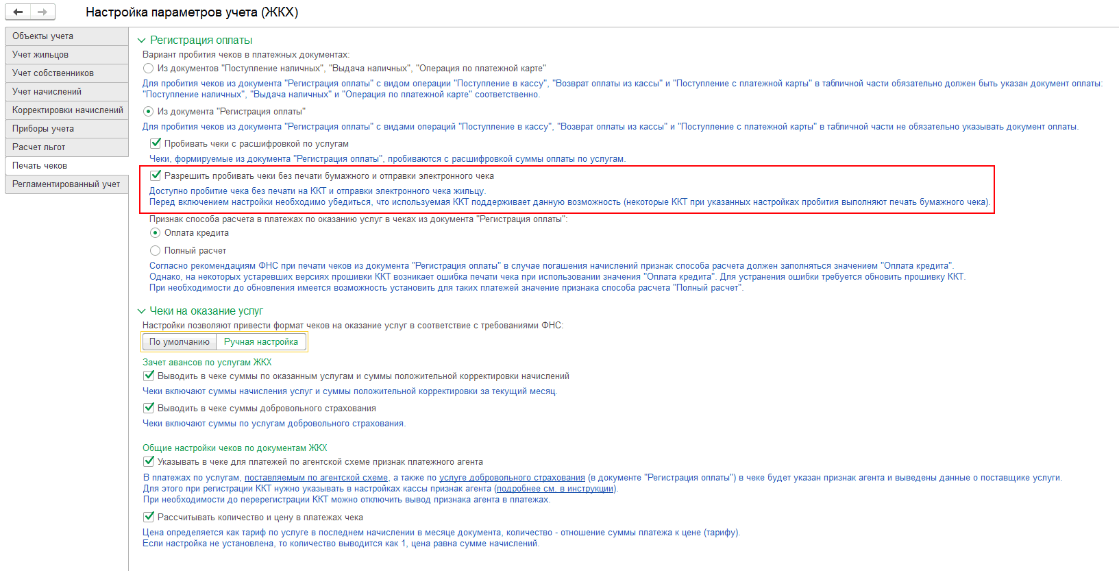 Чек можно не отправлять жильцу (только пробить и отправить в ОФД). Для этого в Настройках параметров учета должен быть установлен флаг «Разрешить пробивать чеки без печати бумажного и отправки электронного чека»: