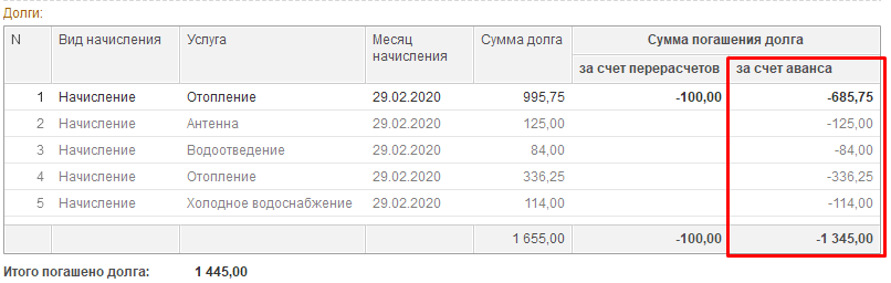По услуге «Отопление» сумма начисления превышает размер аванса, поэтому в документе в серых строках отражается сумма аванса, то есть меньшая из сумм Начисление/ Аванс: