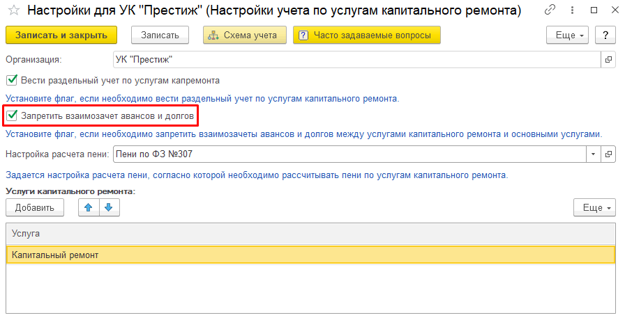 При ведении раздельного учета услуг капитального ремонта редактирование состава группы услуг для ограничения переноса авансов доступно в «Настройках учета по услугам капремонта»: